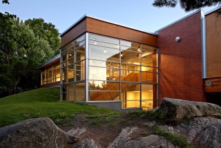 The school is a testament to the local geography and to smart building design. It is cradled between swamp and forest, snug up against a massive granite ridge, allowing students to interact with their rural surroundings while creating an open and inviting place to learn and live.